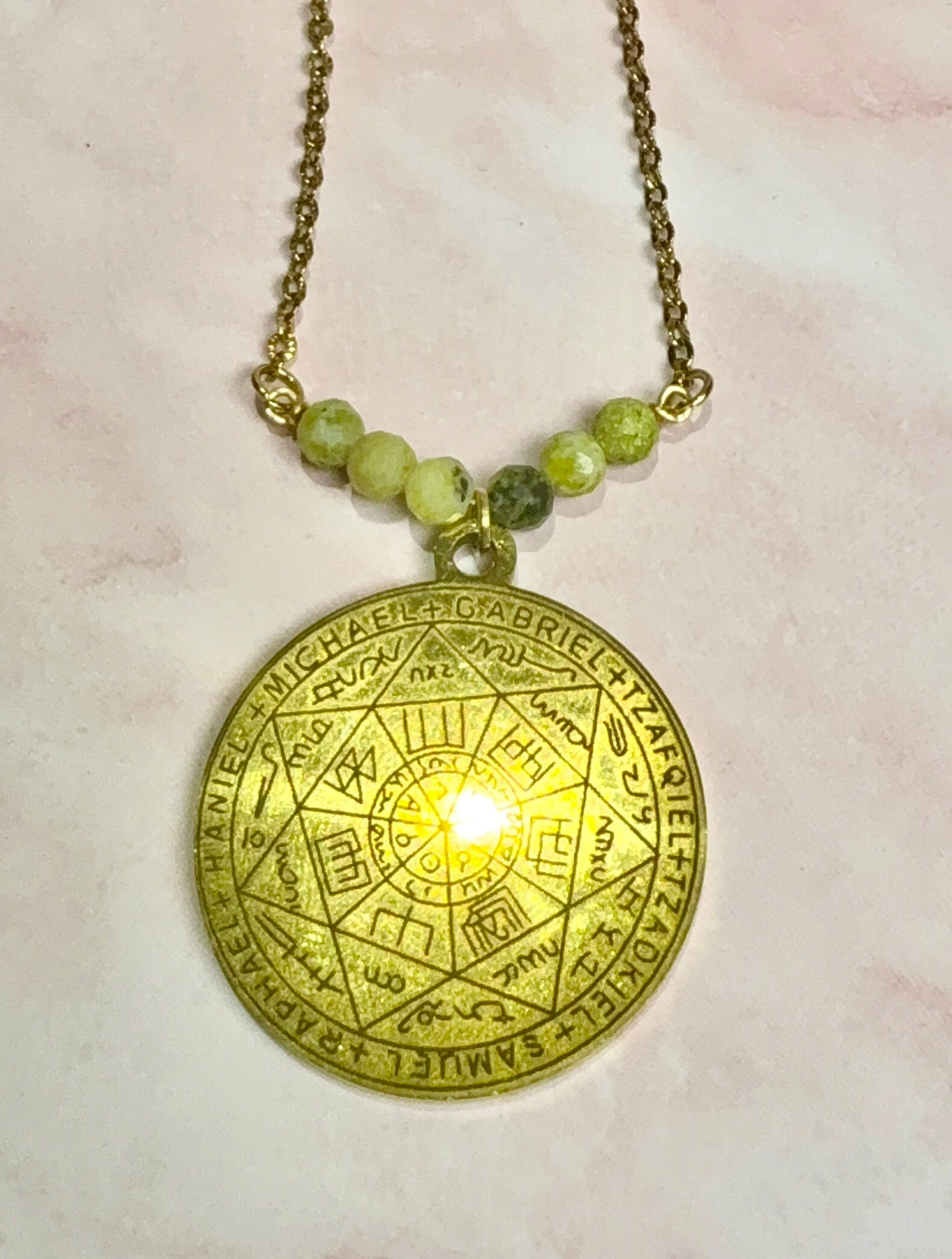 Création artisanale associant la chrysoprase à une plaque gravée des noms des archanges.