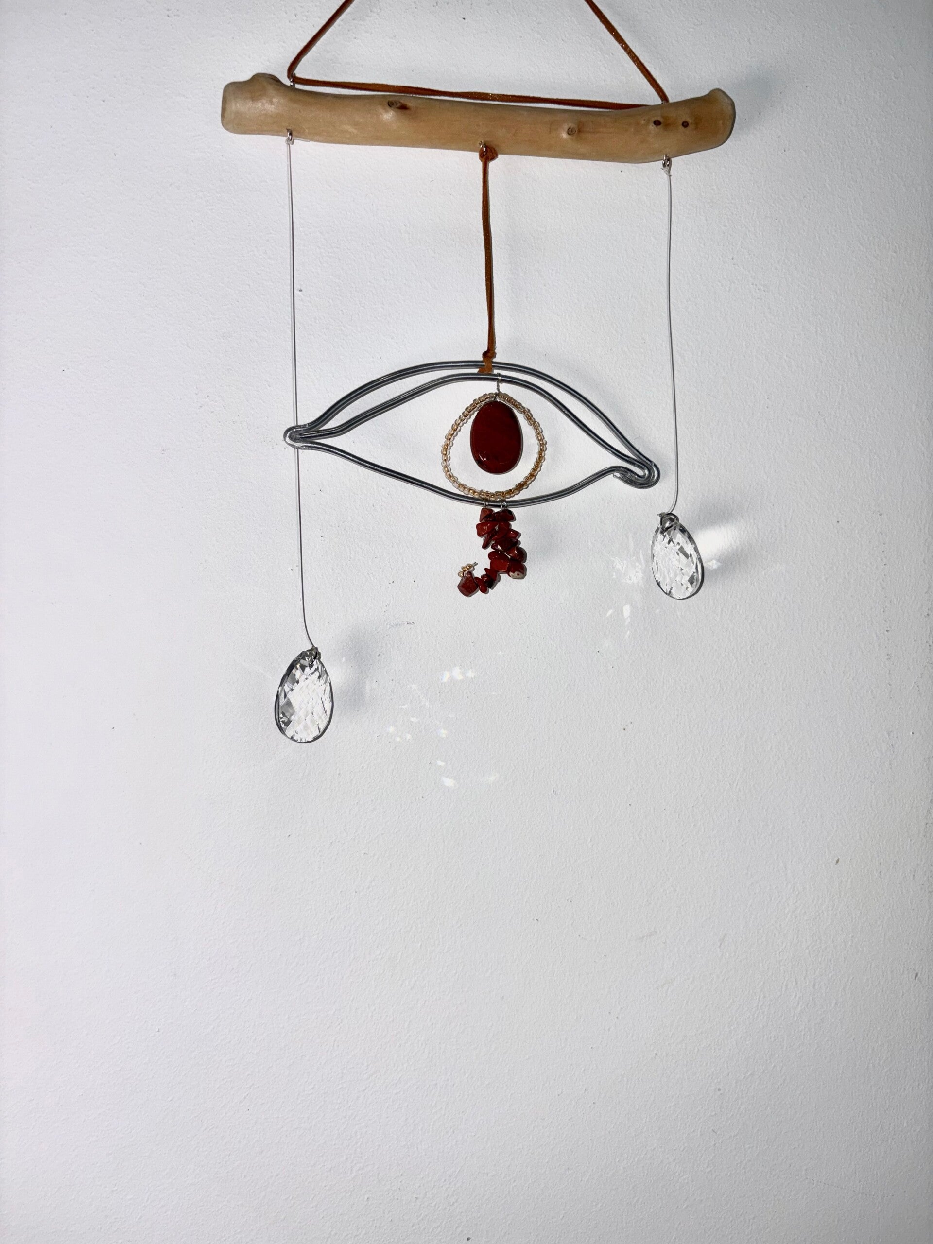 La pierre centrale en jaspe rouge apporte force et ancrage, tandis que les pampilles cristallines diffusent délicatement la lumière dans l’espace.