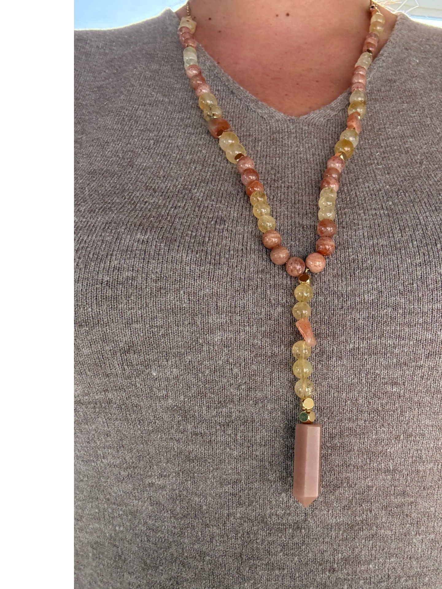 Sautoir long composé de perles aux nuances rosées et dorées, sublimé par un pendentif pendule aux tons pêche lumineux.